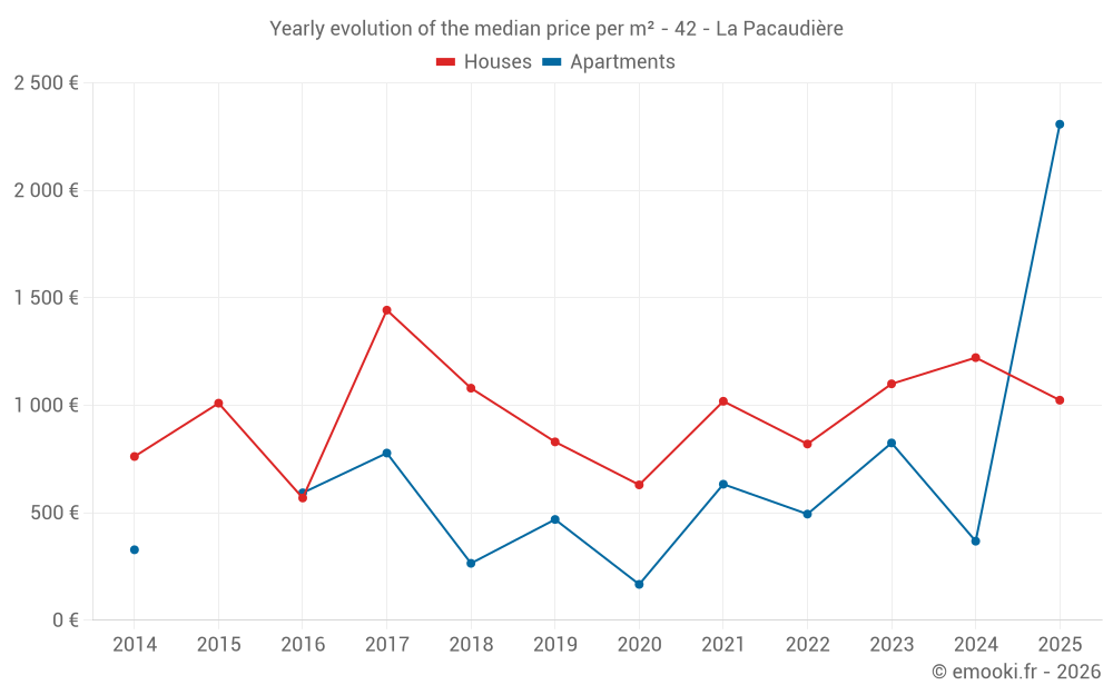 The median price on the 18 house transactions of the last 24 months in the municipality of La Pacaudière was 1 229 € per square meter for a median property value of 117 500 €. Over this period, 60% of transactions were between 761 and 1 865 € per square meter (from the 2nd to the 8th deciles).
