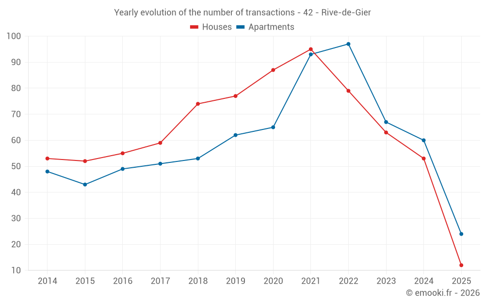 The median price on the 43 house transactions of the last 12 months in the municipality of Rive-de-Gier was 2 476 € per square meter for a median property value of 220 000 €. Over this period, 60% of transactions were between 1 856 and 3 065 € per square meter (from the 2nd to the 8th deciles).