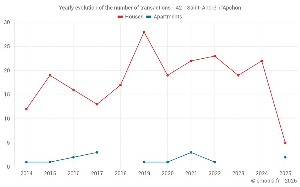 The median price on the 17 house transactions of the last 12 months in the municipality of Saint-André-d'Apchon was 1 675 € per square meter for a median property value of 168 400 €. Over this period, 60% of transactions were between 1 280 and 2 216 € per square meter (from the 2nd to the 8th deciles).