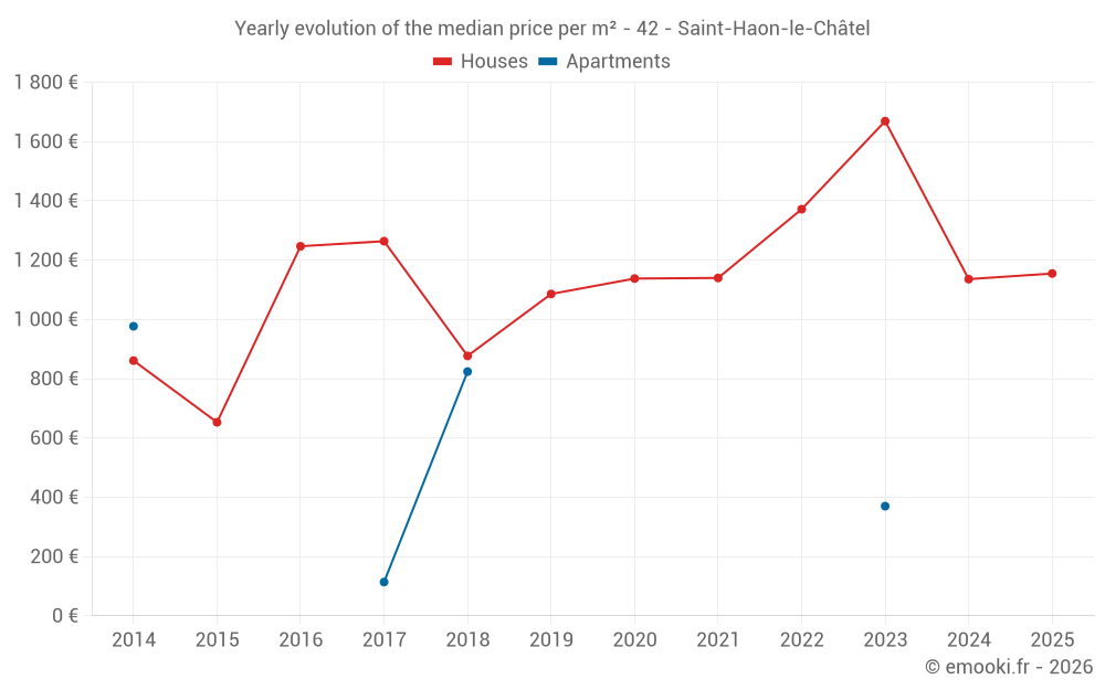The median price on the 14 house transactions of the last 24 months in the municipality of Saint-Haon-le-Châtel was 1 288 € per square meter for a median property value of 113 500 €. Over this period, 60% of transactions were between 920 and 1 643 € per square meter (from the 2nd to the 8th deciles).