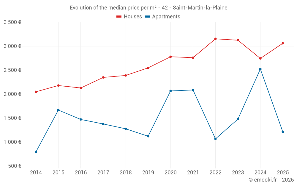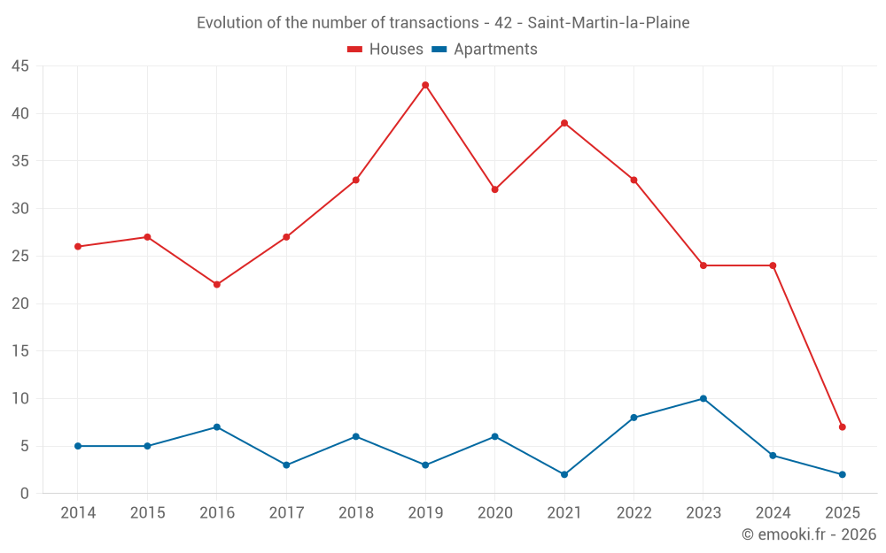 The median price on the 22 house transactions of the last 12 months in the municipality of Saint-Martin-la-Plaine was 3 064 € per square meter for a median property value of 309 908 €. Over this period, 60% of transactions were between 2 599 and 3 497 € per square meter (from the 2nd to the 8th deciles).