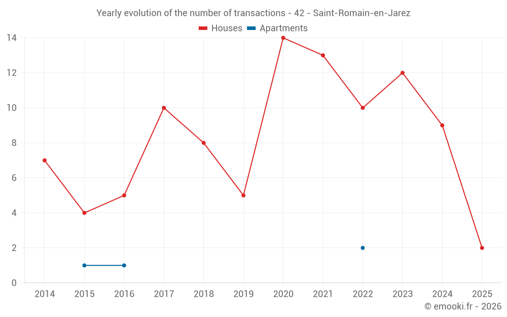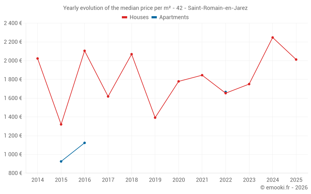 The median price on the 17 house transactions of the last 24 months in the municipality of Saint-Romain-en-Jarez was 1 674 € per square meter for a median property value of 215 000 €. Over this period, 60% of transactions were between 1 517 and 2 447 € per square meter (from the 2nd to the 8th deciles).