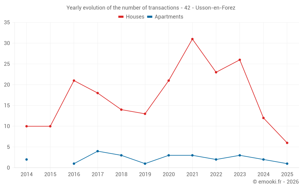 The median price on the 34 house transactions of the last 24 months in the municipality of Usson-en-Forez was 1 492 € per square meter for a median property value of 138 800 €. Over this period, 60% of transactions were between 761 and 2 201 € per square meter (from the 2nd to the 8th deciles).