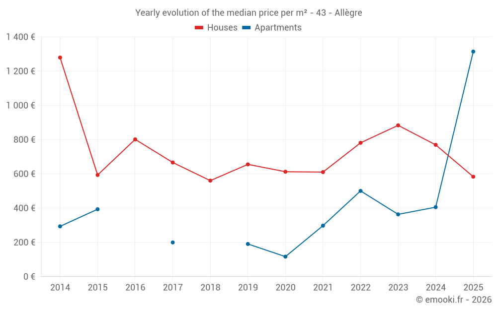 The median price on the 27 house transactions of the last 24 months in the municipality of Allègre was 833 € per square meter for a median property value of 60 000 €. Over this period, 60% of transactions were between 376 and 1 419 € per square meter (from the 2nd to the 8th deciles).