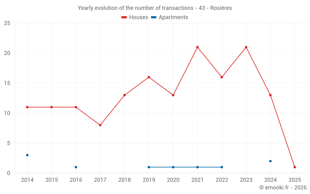 The median price on the 23 house transactions of the last 24 months in the municipality of Rosières was 1 374 € per square meter for a median property value of 139 000 €. Over this period, 60% of transactions were between 781 and 2 059 € per square meter (from the 2nd to the 8th deciles).