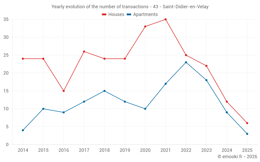 The median price on the 28 house transactions of the last 24 months in the municipality of Saint-Didier-en-Velay was 1 822 € per square meter for a median property value of 210 000 €. Over this period, 60% of transactions were between 943 and 2 488 € per square meter (from the 2nd to the 8th deciles).