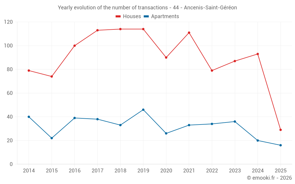 The median price on the 29 house transactions of the last 6 months in the municipality of Ancenis-Saint-Géréon was 2 252 € per square meter for a median property value of 250 000 €. Over this period, 60% of transactions were between 1 674 and 2 824 € per square meter (from the 2nd to the 8th deciles).