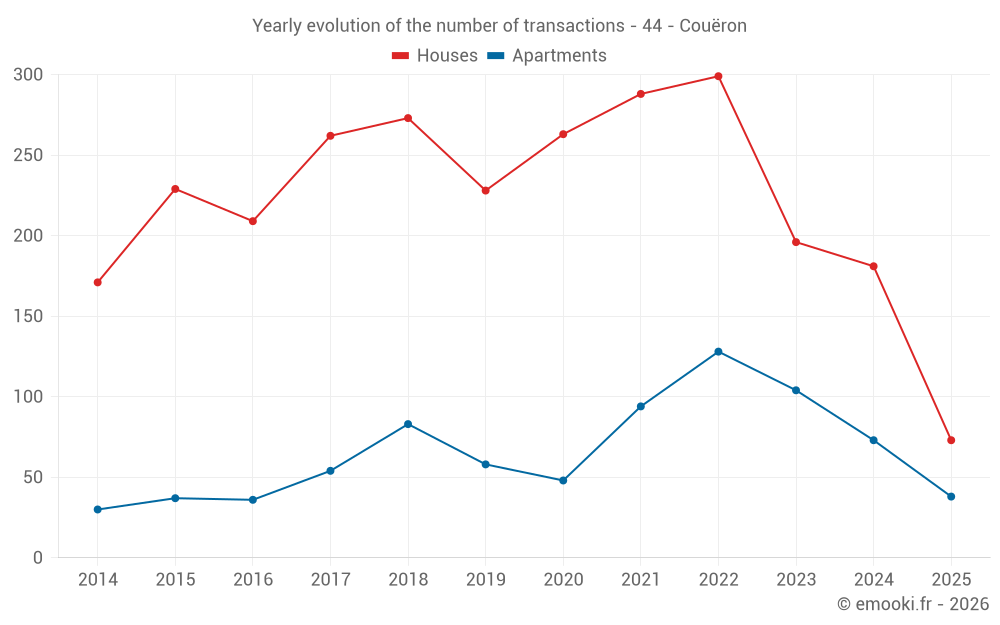 The median price on the 33 house transactions of the last 3 months in the municipality of Couëron was 3 355 € per square meter for a median property value of 279 000 €. Over this period, 60% of transactions were between 2 226 and 3 731 € per square meter (from the 2nd to the 8th deciles).