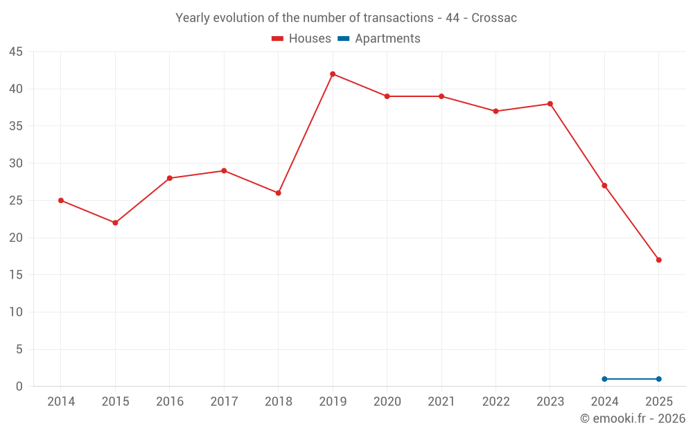The median price on the 33 house transactions of the last 12 months in the municipality of Crossac was 2 130 € per square meter for a median property value of 203 000 €. Over this period, 60% of transactions were between 1 440 and 2 693 € per square meter (from the 2nd to the 8th deciles).