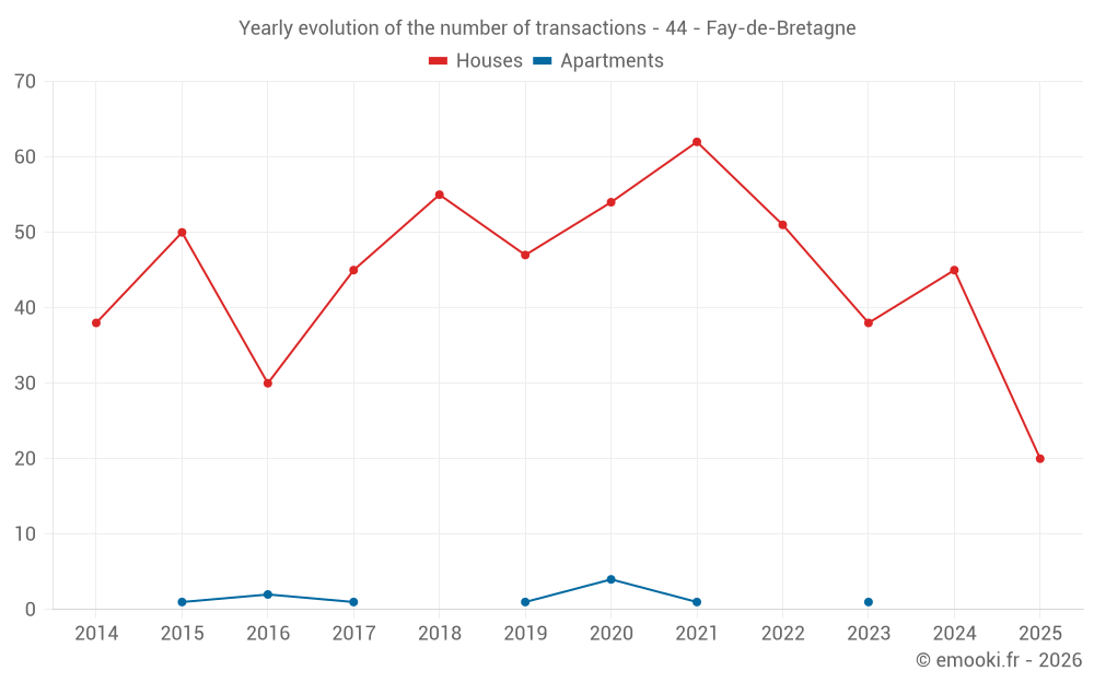 The median price on the 20 house transactions of the last 6 months in the municipality of Fay-de-Bretagne was 2 148 € per square meter for a median property value of 246 692 €. Over this period, 60% of transactions were between 1 554 and 2 407 € per square meter (from the 2nd to the 8th deciles).