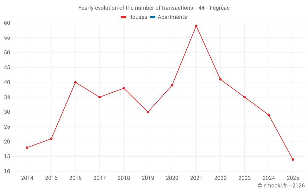 The median price on the 29 house transactions of the last 12 months in the municipality of Fégréac was 1 643 € per square meter for a median property value of 145 000 €. Over this period, 60% of transactions were between 1 100 and 2 227 € per square meter (from the 2nd to the 8th deciles).