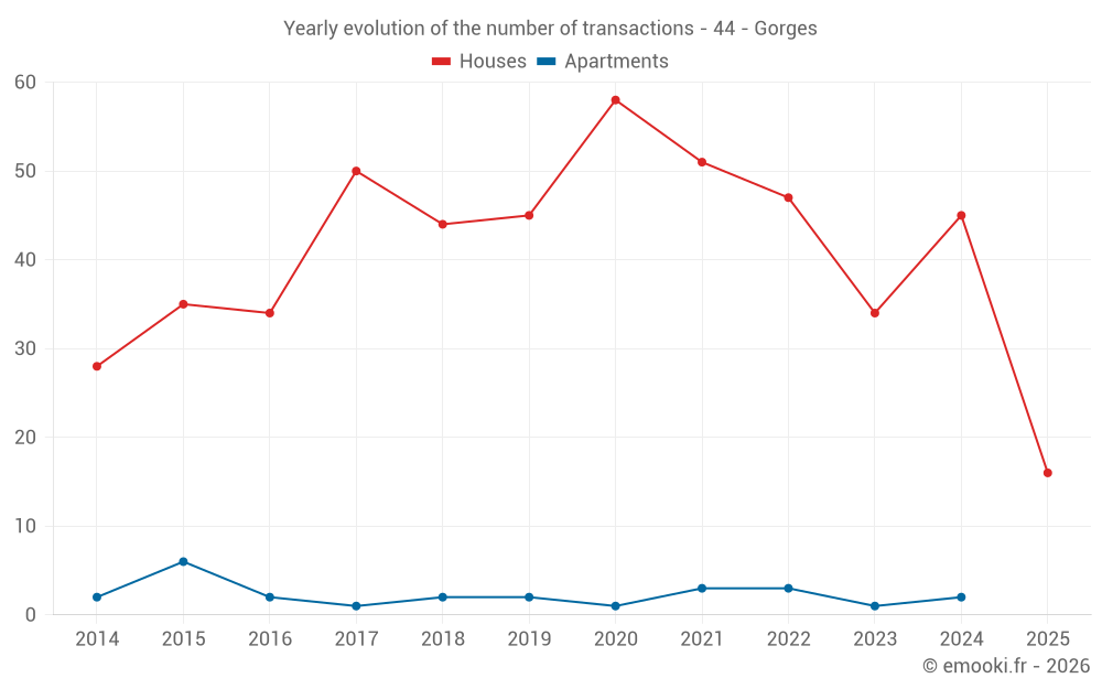 The median price on the 43 house transactions of the last 12 months in the municipality of Gorges was 2 606 € per square meter for a median property value of 258 000 €. Over this period, 60% of transactions were between 1 895 and 3 049 € per square meter (from the 2nd to the 8th deciles).