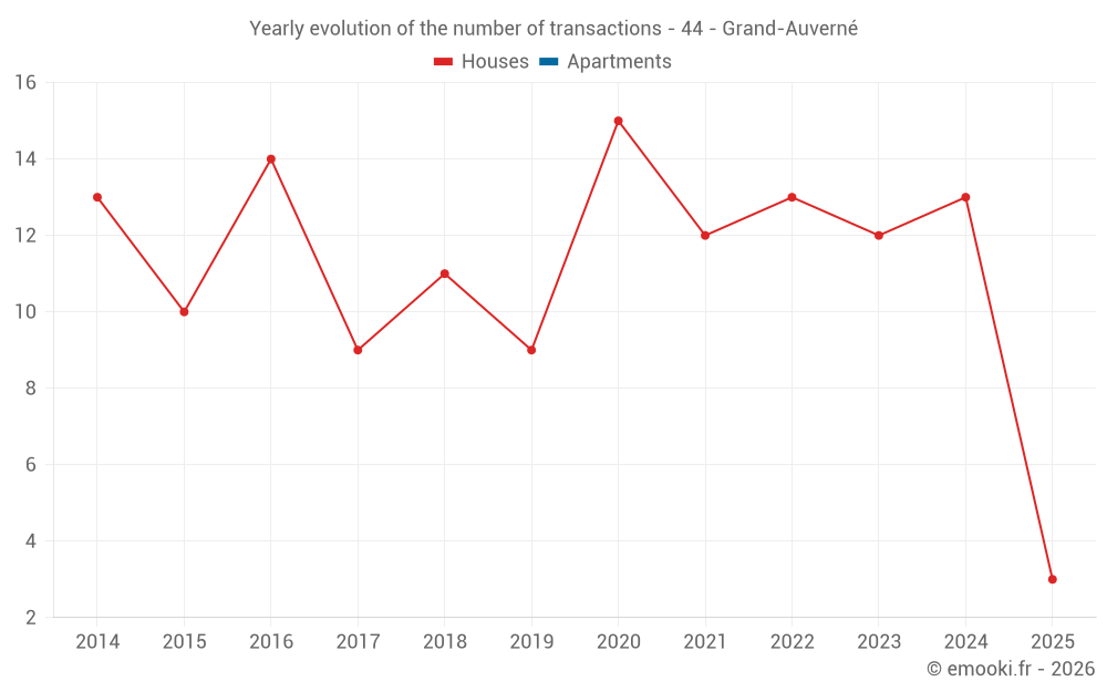 The median price on the 21 house transactions of the last 24 months in the municipality of Grand-Auverné was 1 318 € per square meter for a median property value of 110 000 €. Over this period, 60% of transactions were between 851 and 1 855 € per square meter (from the 2nd to the 8th deciles).