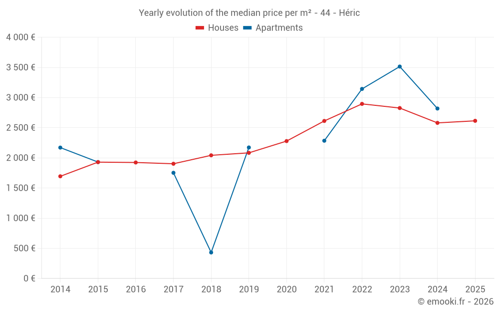 The median price on the 19 house transactions of the last 6 months in the municipality of Héric was 2 614 € per square meter for a median property value of 288 000 €. Over this period, 60% of transactions were between 1 721 and 2 902 € per square meter (from the 2nd to the 8th deciles).