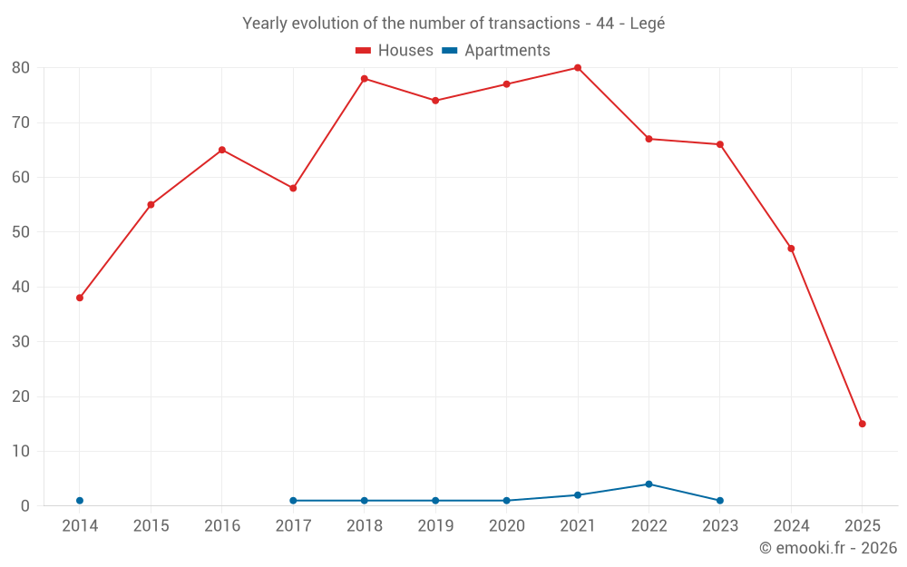 The median price on the 44 house transactions of the last 12 months in the municipality of Legé was 1 760 € per square meter for a median property value of 161 250 €. Over this period, 60% of transactions were between 1 227 and 2 401 € per square meter (from the 2nd to the 8th deciles).