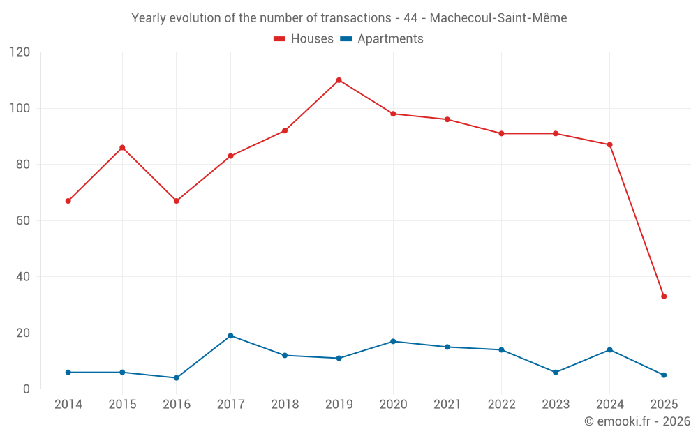 The median price on the 33 house transactions of the last 6 months in the municipality of Machecoul-Saint-Même was 2 434 € per square meter for a median property value of 185 000 €. Over this period, 60% of transactions were between 1 968 and 2 664 € per square meter (from the 2nd to the 8th deciles).