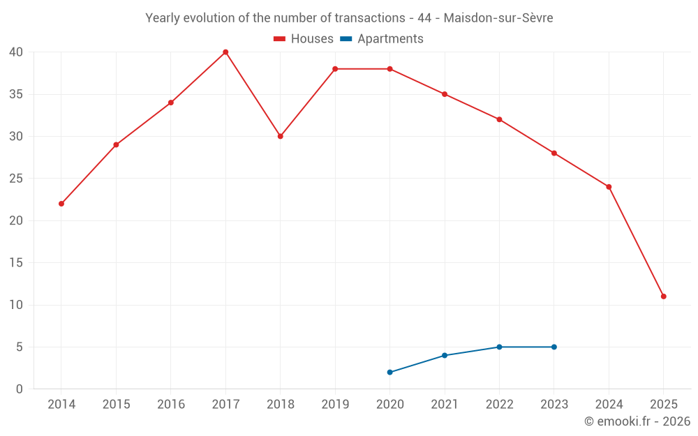 The median price on the 23 house transactions of the last 12 months in the municipality of Maisdon-sur-Sèvre was 2 607 € per square meter for a median property value of 235 000 €. Over this period, 60% of transactions were between 2 133 and 3 156 € per square meter (from the 2nd to the 8th deciles).