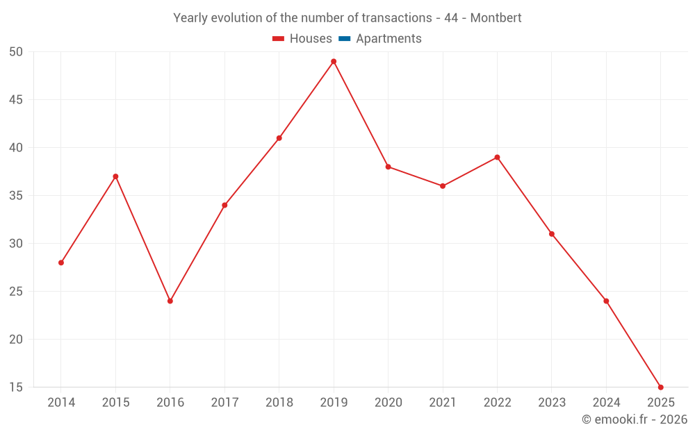 The median price on the 30 house transactions of the last 12 months in the municipality of Montbert was 2 425 € per square meter for a median property value of 224 000 €. Over this period, 60% of transactions were between 1 682 and 2 959 € per square meter (from the 2nd to the 8th deciles).
