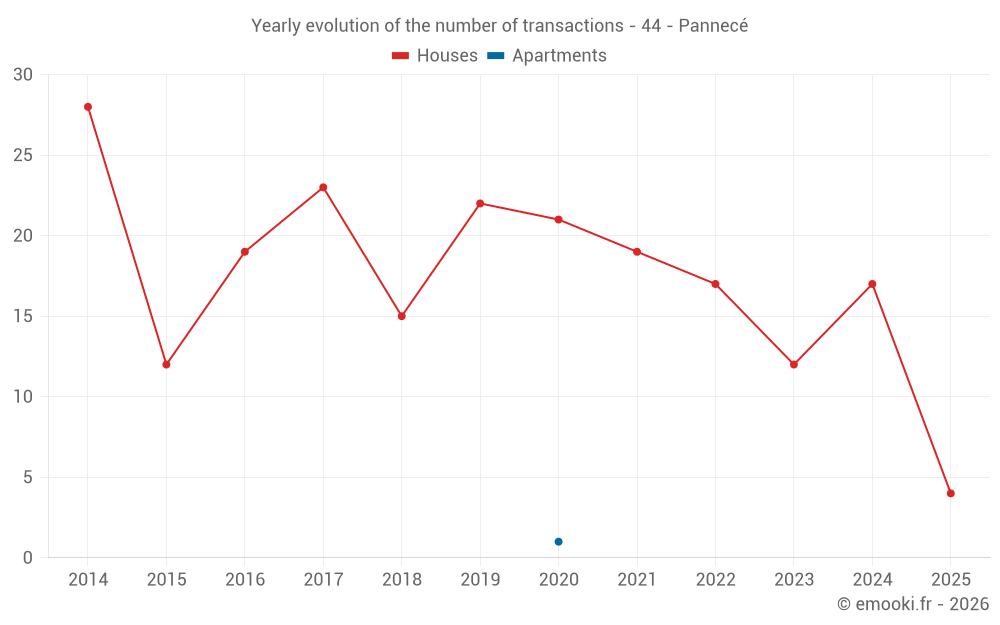 The median price on the 29 house transactions of the last 24 months in the municipality of Pannecé was 1 675 € per square meter for a median property value of 152 381 €. Over this period, 60% of transactions were between 1 244 and 2 270 € per square meter (from the 2nd to the 8th deciles).