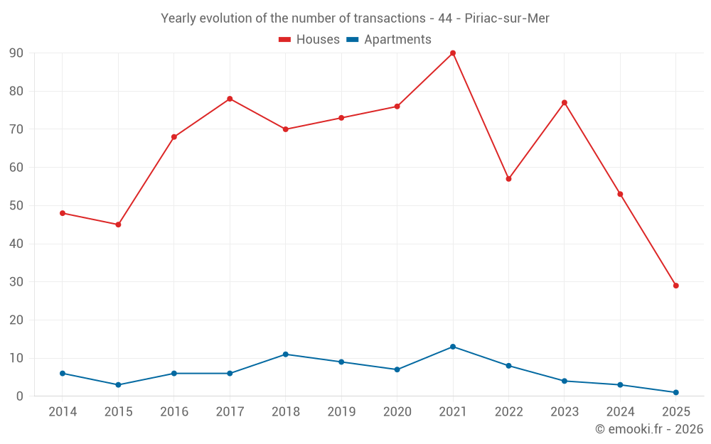 The median price on the 29 house transactions of the last 6 months in the municipality of Piriac-sur-Mer was 4 293 € per square meter for a median property value of 409 900 €. Over this period, 60% of transactions were between 3 010 and 6 122 € per square meter (from the 2nd to the 8th deciles).