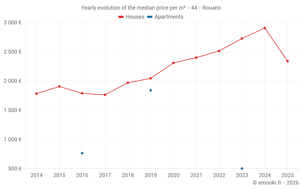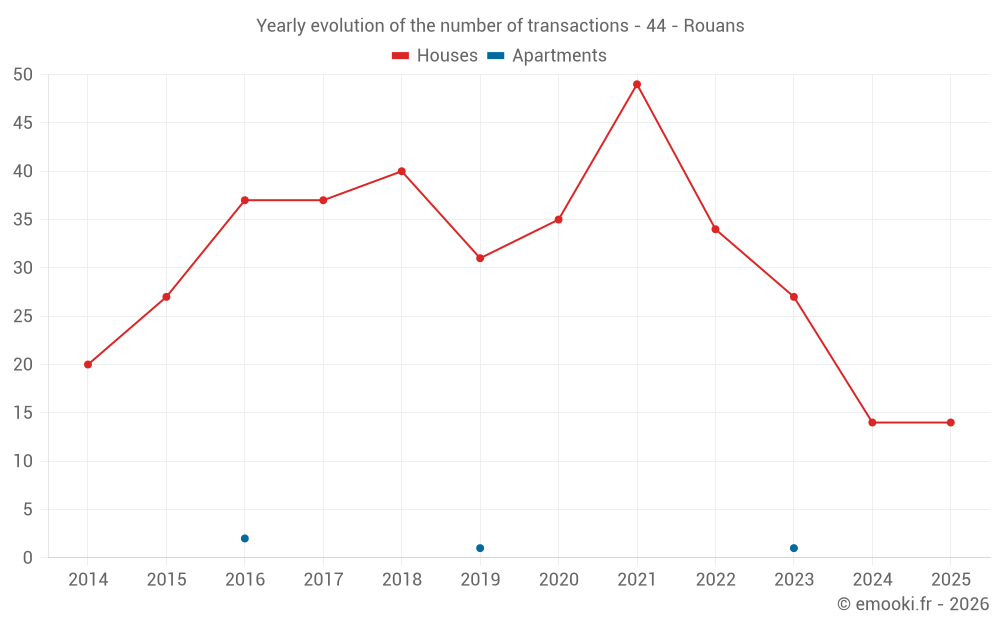 The median price on the 21 house transactions of the last 12 months in the municipality of Rouans was 2 416 € per square meter for a median property value of 270 000 €. Over this period, 60% of transactions were between 1 781 and 3 272 € per square meter (from the 2nd to the 8th deciles).