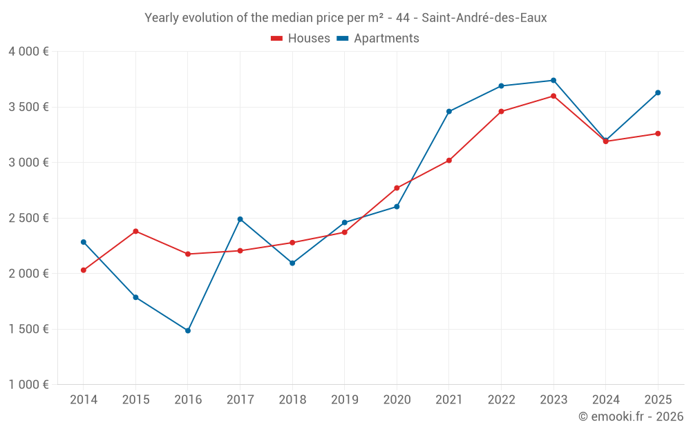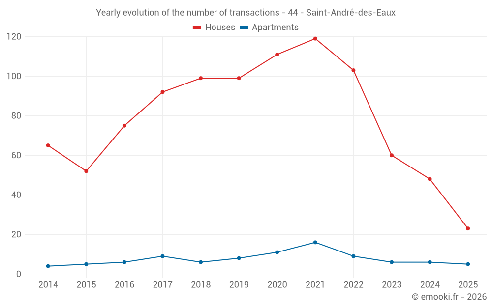 The median price on the 23 house transactions of the last 6 months in the municipality of Saint-André-des-Eaux was 3 261 € per square meter for a median property value of 315 000 €. Over this period, 60% of transactions were between 2 764 and 3 843 € per square meter (from the 2nd to the 8th deciles).