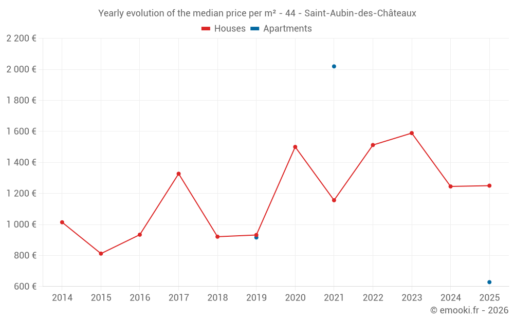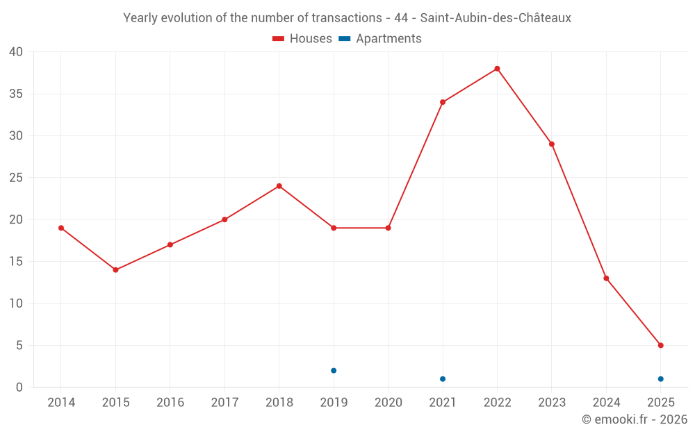 The median price on the 31 house transactions of the last 24 months in the municipality of Saint-Aubin-des-Châteaux was 1 420 € per square meter for a median property value of 150 000 €. Over this period, 60% of transactions were between 1 170 and 1 900 € per square meter (from the 2nd to the 8th deciles).