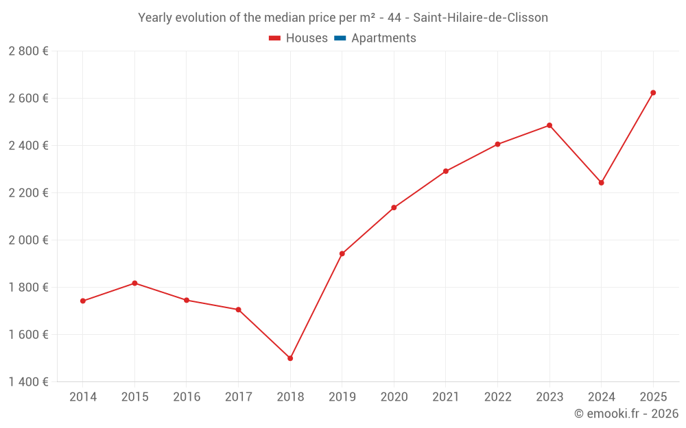 The median price on the 17 house transactions of the last 12 months in the municipality of Saint-Hilaire-de-Clisson was 2 581 € per square meter for a median property value of 240 000 €. Over this period, 60% of transactions were between 1 744 and 2 742 € per square meter (from the 2nd to the 8th deciles).