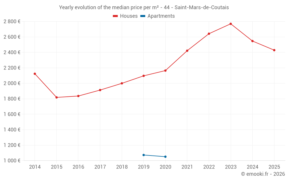 The median price on the 17 house transactions of the last 12 months in the municipality of Saint-Mars-de-Coutais was 2 484 € per square meter for a median property value of 246 100 €. Over this period, 60% of transactions were between 1 977 and 2 980 € per square meter (from the 2nd to the 8th deciles).