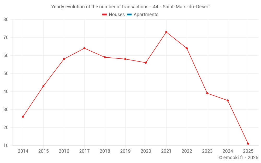 The median price on the 36 house transactions of the last 12 months in the municipality of Saint-Mars-du-Désert was 2 702 € per square meter for a median property value of 258 500 €. Over this period, 60% of transactions were between 2 341 and 3 059 € per square meter (from the 2nd to the 8th deciles).