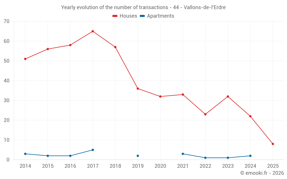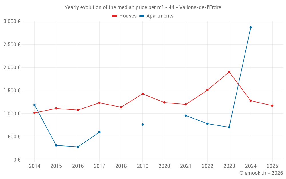 The median price on the 18 house transactions of the last 12 months in the municipality of Vallons-de-l'Erdre was 1 174 € per square meter for a median property value of 122 500 €. Over this period, 60% of transactions were between 693 and 1 830 € per square meter (from the 2nd to the 8th deciles).
