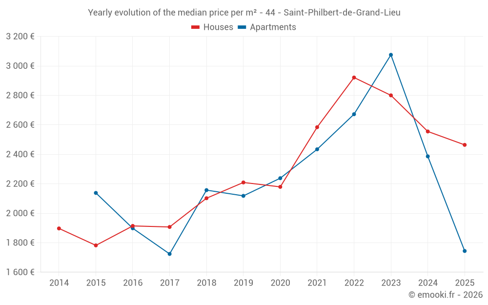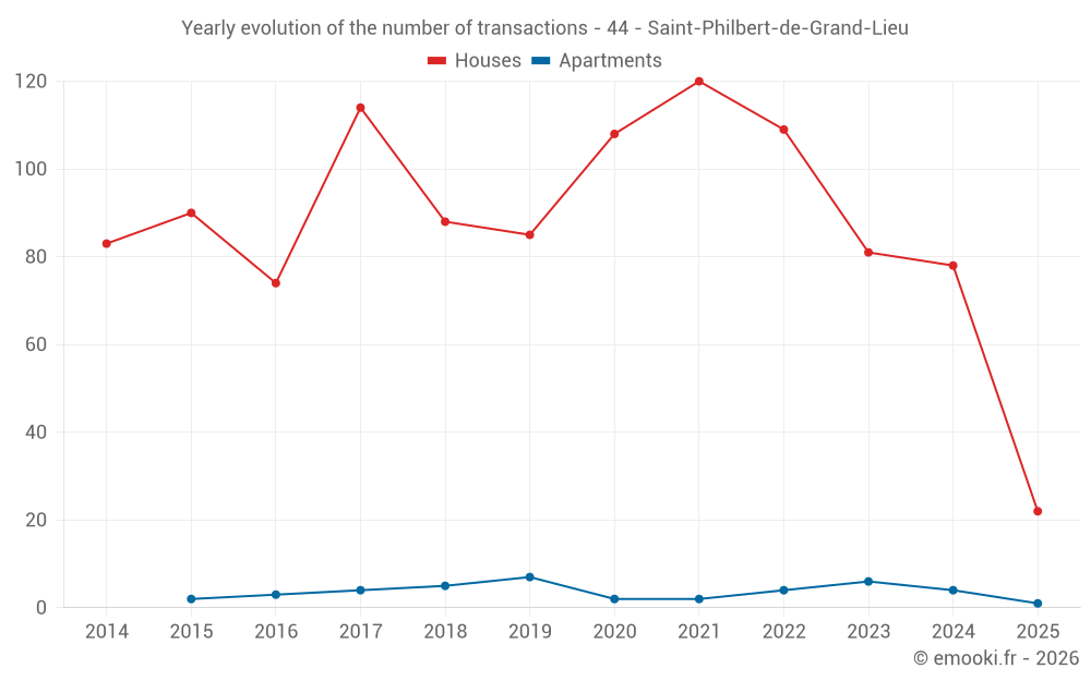 The median price on the 22 house transactions of the last 6 months in the municipality of Saint-Philbert-de-Grand-Lieu was 2 464 € per square meter for a median property value of 248 000 €. Over this period, 60% of transactions were between 1 812 and 2 772 € per square meter (from the 2nd to the 8th deciles).