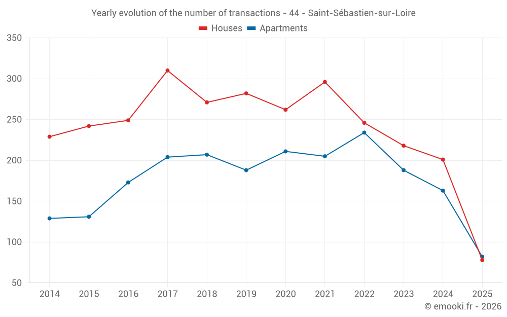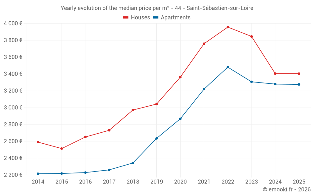 The median price on the 78 house transactions of the last 6 months in the municipality of Saint-Sébastien-sur-Loire was 3 403 € per square meter for a median property value of 308 950 €. Over this period, 60% of transactions were between 2 775 and 4 028 € per square meter (from the 2nd to the 8th deciles).