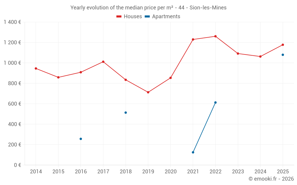 The median price on the 26 house transactions of the last 12 months in the municipality of Sion-les-Mines was 1 058 € per square meter for a median property value of 97 500 €. Over this period, 60% of transactions were between 721 and 1 511 € per square meter (from the 2nd to the 8th deciles).