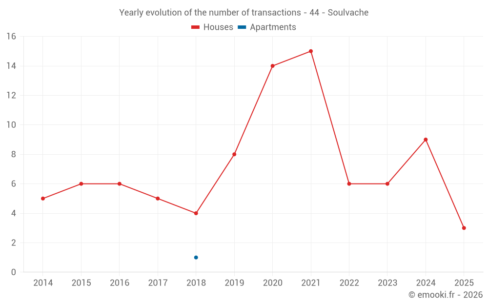 The median price on the 15 house transactions of the last 24 months in the municipality of Soulvache was 1 071 € per square meter for a median property value of 80 000 €. Over this period, 60% of transactions were between 583 and 1 368 € per square meter (from the 2nd to the 8th deciles).