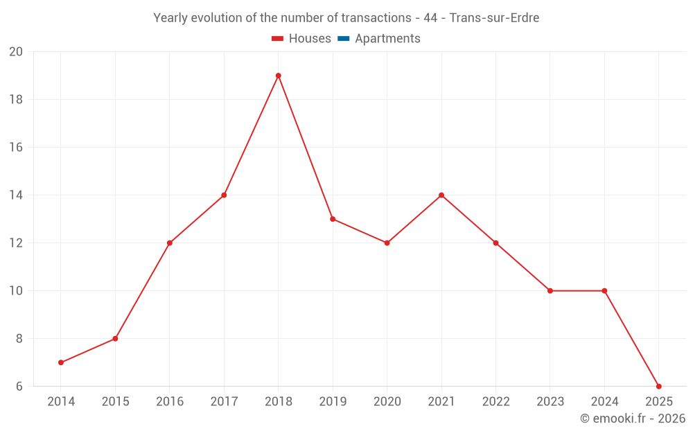 The median price on the 23 house transactions of the last 24 months in the municipality of Trans-sur-Erdre was 1 705 € per square meter for a median property value of 185 000 €. Over this period, 60% of transactions were between 1 209 and 2 685 € per square meter (from the 2nd to the 8th deciles).