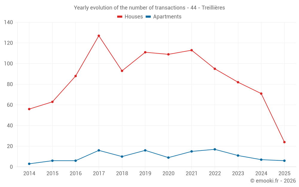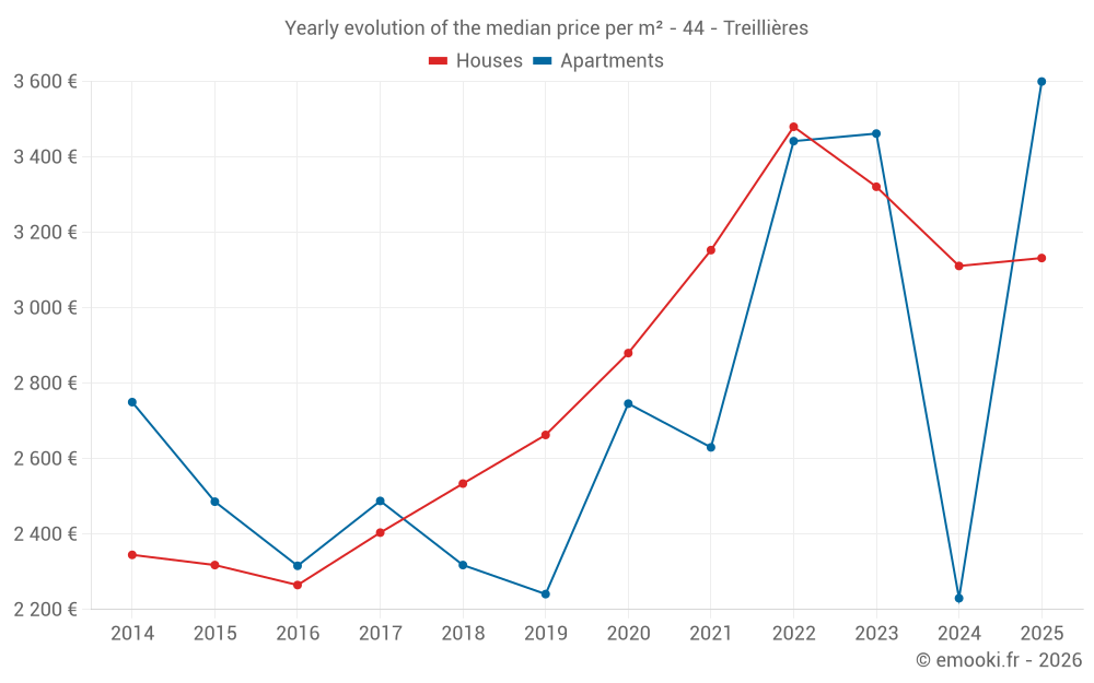 The median price on the 24 house transactions of the last 6 months in the municipality of Treillières was 3 132 € per square meter for a median property value of 331 250 €. Over this period, 60% of transactions were between 2 632 and 3 731 € per square meter (from the 2nd to the 8th deciles).