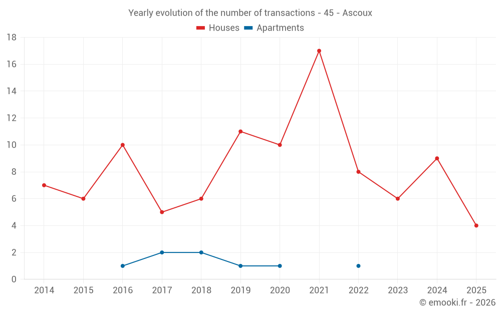 The median price on the 18 house transactions of the last 24 months in the municipality of Ascoux was 1 523 € per square meter for a median property value of 156 075 €. Over this period, 60% of transactions were between 1 029 and 1 802 € per square meter (from the 2nd to the 8th deciles).