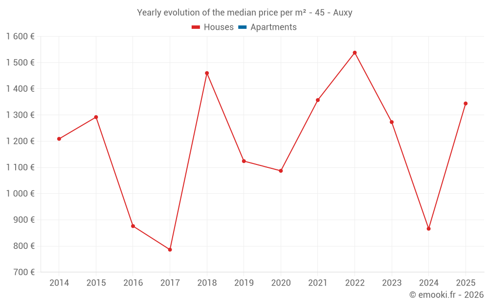 The median price on the 22 house transactions of the last 24 months in the municipality of Auxy was 1 166 € per square meter for a median property value of 102 500 €. Over this period, 60% of transactions were between 818 and 1 603 € per square meter (from the 2nd to the 8th deciles).