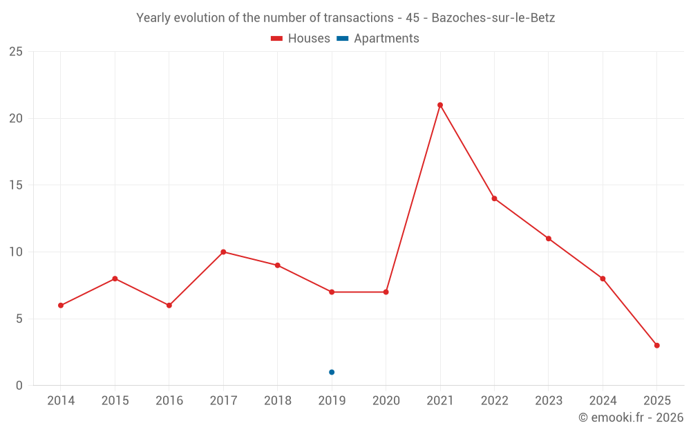 The median price on the 19 house transactions of the last 24 months in the municipality of Bazoches-sur-le-Betz was 1 670 € per square meter for a median property value of 139 000 €. Over this period, 60% of transactions were between 799 and 2 370 € per square meter (from the 2nd to the 8th deciles).