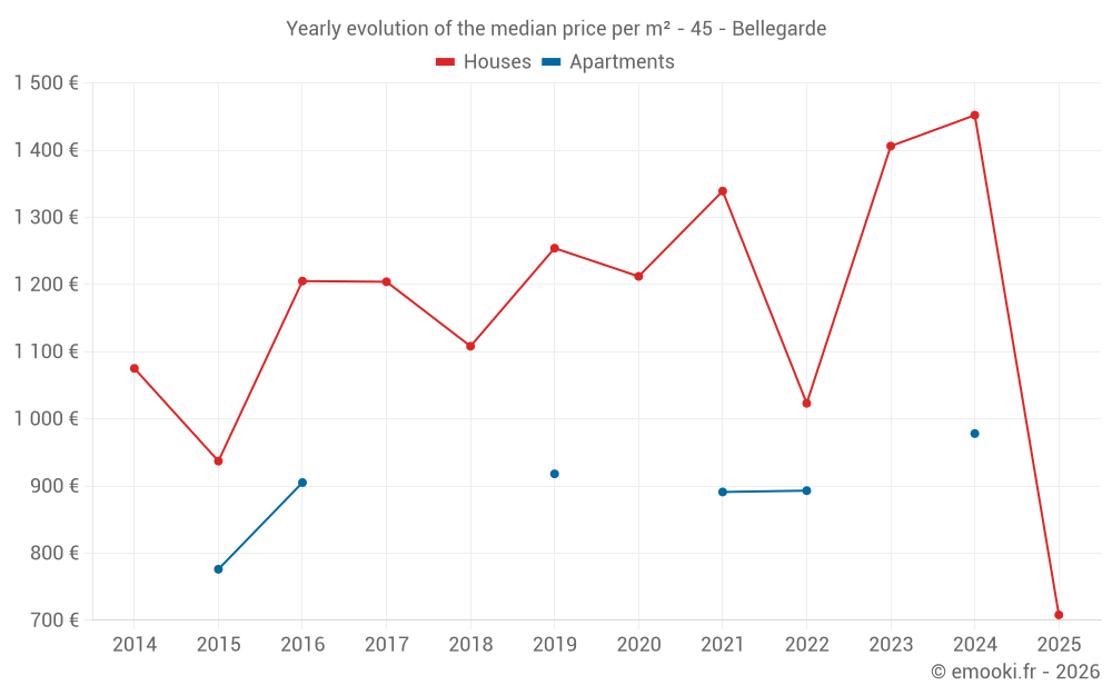 The median price on the 32 house transactions of the last 24 months in the municipality of Bellegarde was 1 249 € per square meter for a median property value of 97 000 €. Over this period, 60% of transactions were between 653 and 1 703 € per square meter (from the 2nd to the 8th deciles).
