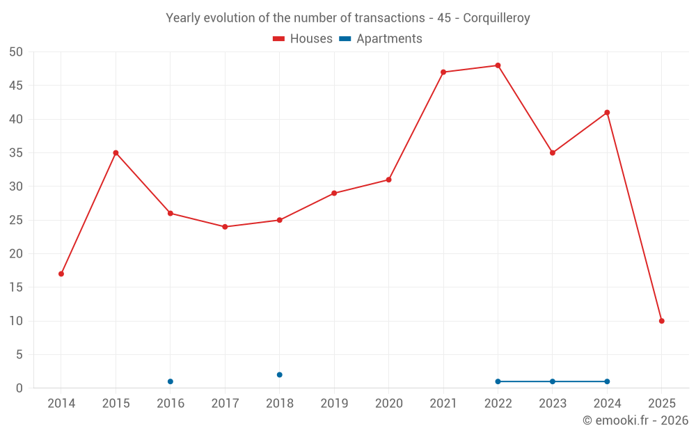 The median price on the 31 house transactions of the last 12 months in the municipality of Corquilleroy was 1 736 € per square meter for a median property value of 159 840 €. Over this period, 60% of transactions were between 1 314 and 2 175 € per square meter (from the 2nd to the 8th deciles).