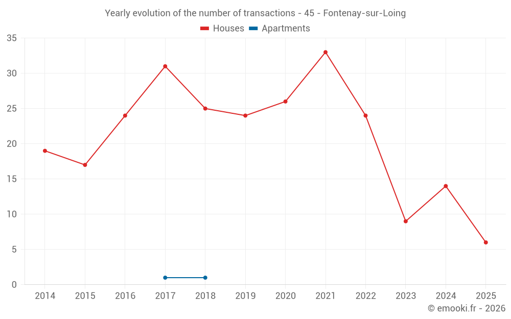 The median price on the 23 house transactions of the last 24 months in the municipality of Fontenay-sur-Loing was 1 476 € per square meter for a median property value of 145 000 €. Over this period, 60% of transactions were between 983 and 1 936 € per square meter (from the 2nd to the 8th deciles).