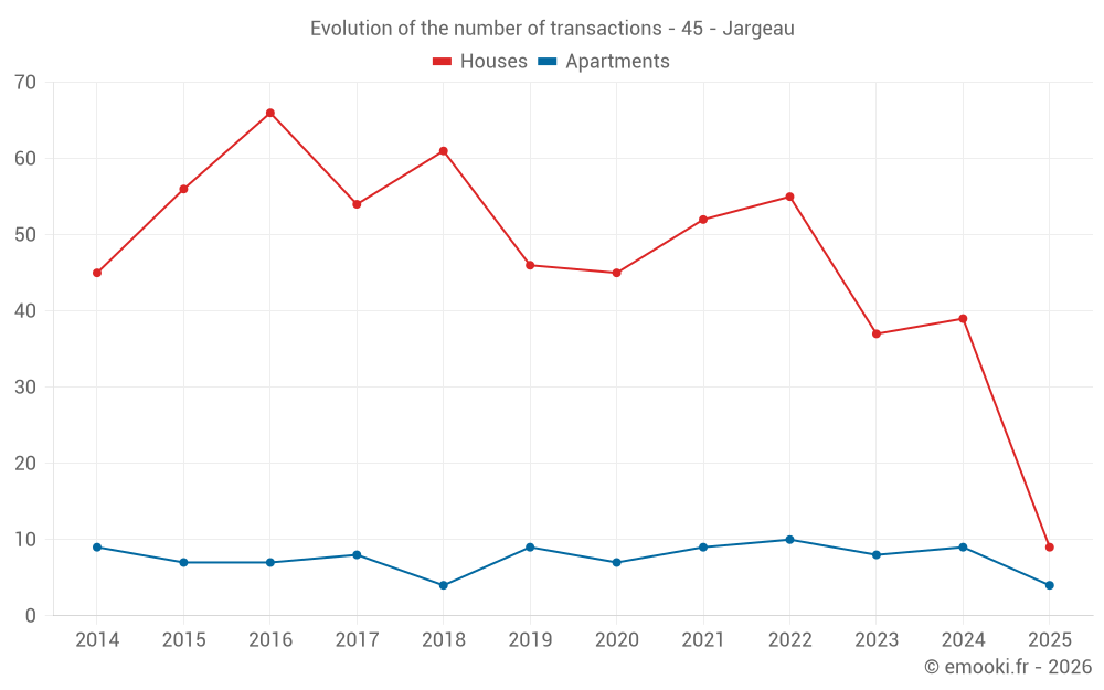 The median price on the 30 house transactions of the last 12 months in the municipality of Jargeau was 1 918 € per square meter for a median property value of 194 950 €. Over this period, 60% of transactions were between 1 556 and 2 190 € per square meter (from the 2nd to the 8th deciles).