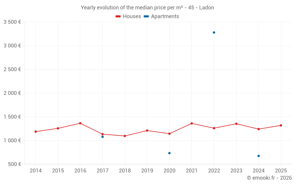 The median price on the 16 house transactions of the last 12 months in the municipality of Ladon was 1 360 € per square meter for a median property value of 113 000 €. Over this period, 60% of transactions were between 957 and 1 597 € per square meter (from the 2nd to the 8th deciles).