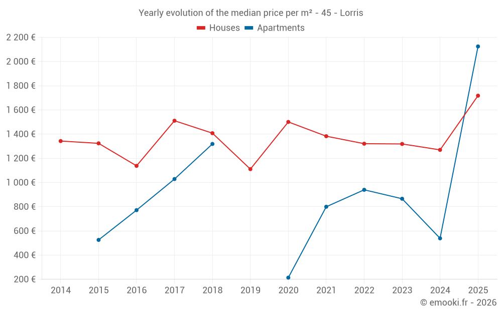 The median price on the 27 house transactions of the last 12 months in the municipality of Lorris was 1 414 € per square meter for a median property value of 135 000 €. Over this period, 60% of transactions were between 1 042 and 1 869 € per square meter (from the 2nd to the 8th deciles).