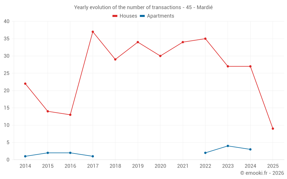 The median price on the 22 house transactions of the last 12 months in the municipality of Mardié was 2 314 € per square meter for a median property value of 231 850 €. Over this period, 60% of transactions were between 1 617 and 2 619 € per square meter (from the 2nd to the 8th deciles).