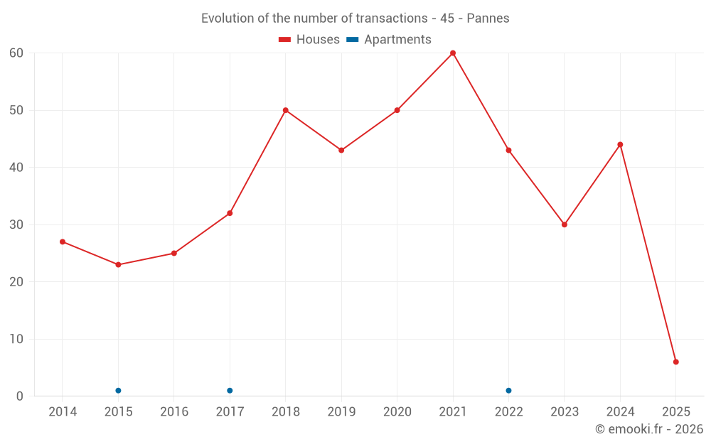 The median price on the 25 house transactions of the last 12 months in the municipality of Pannes was 1 596 € per square meter for a median property value of 152 113 €. Over this period, 60% of transactions were between 1 289 and 1 976 € per square meter (from the 2nd to the 8th deciles).