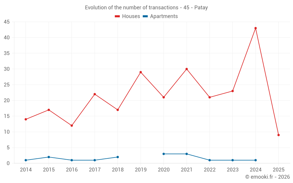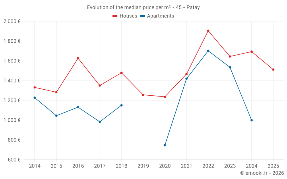 The median price on the 37 house transactions of the last 12 months in the municipality of Patay was 1 696 € per square meter for a median property value of 168 000 €. Over this period, 60% of transactions were between 1 263 and 2 137 € per square meter (from the 2nd to the 8th deciles).