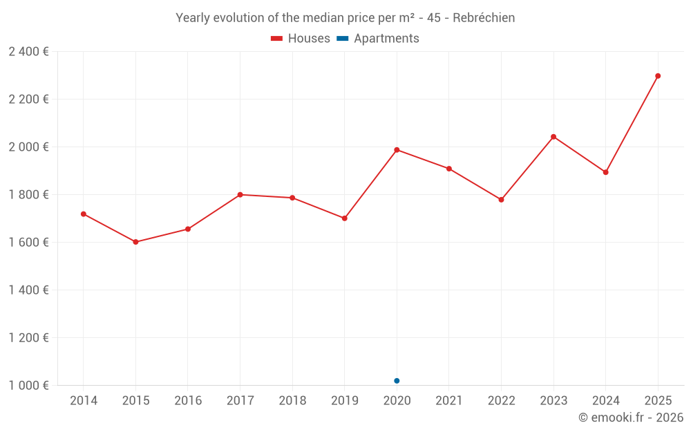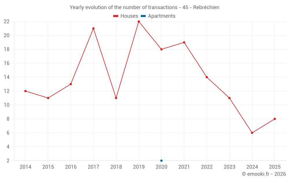 The median price on the 18 house transactions of the last 24 months in the municipality of Rebréchien was 2 224 € per square meter for a median property value of 236 000 €. Over this period, 60% of transactions were between 1 931 and 2 525 € per square meter (from the 2nd to the 8th deciles).